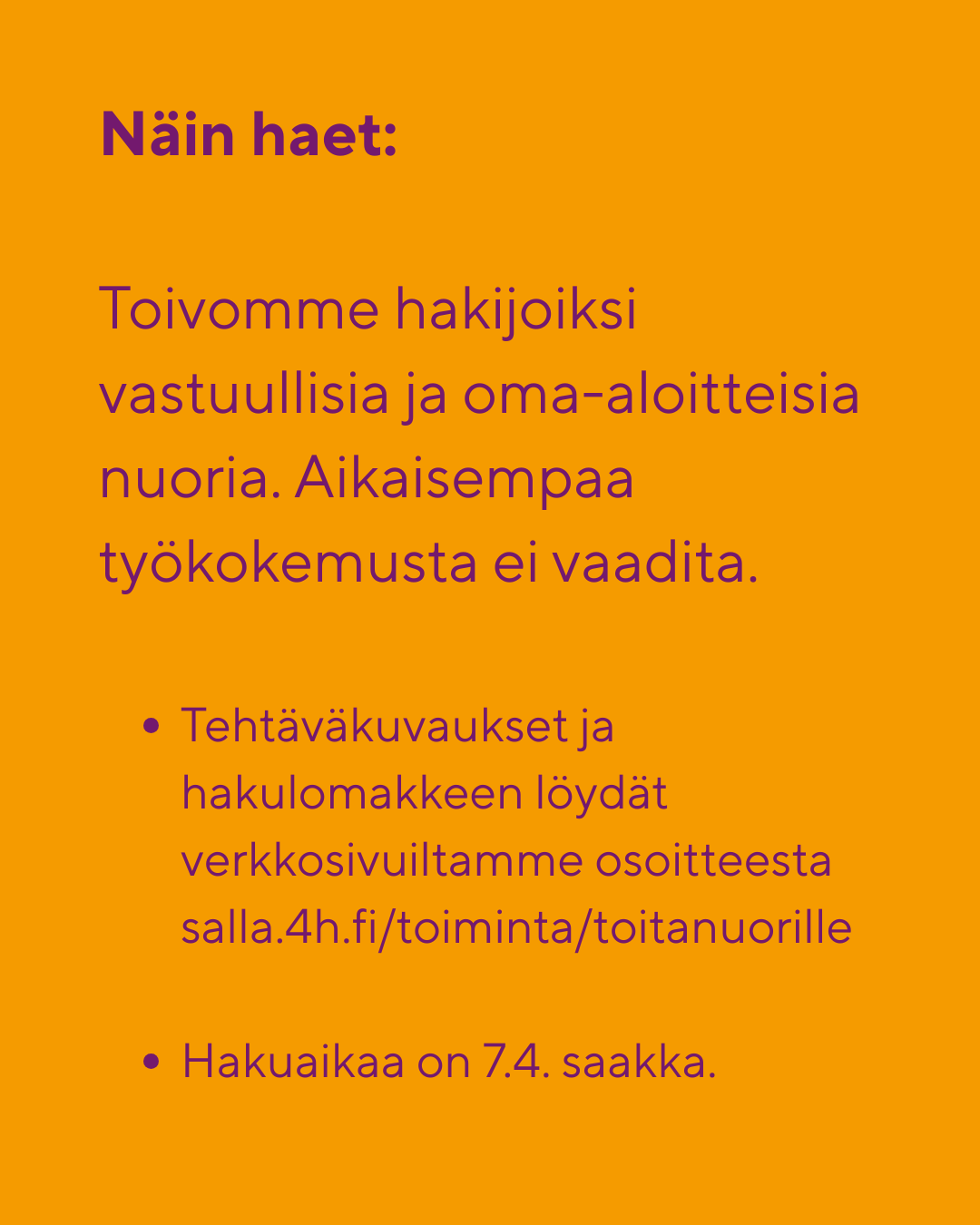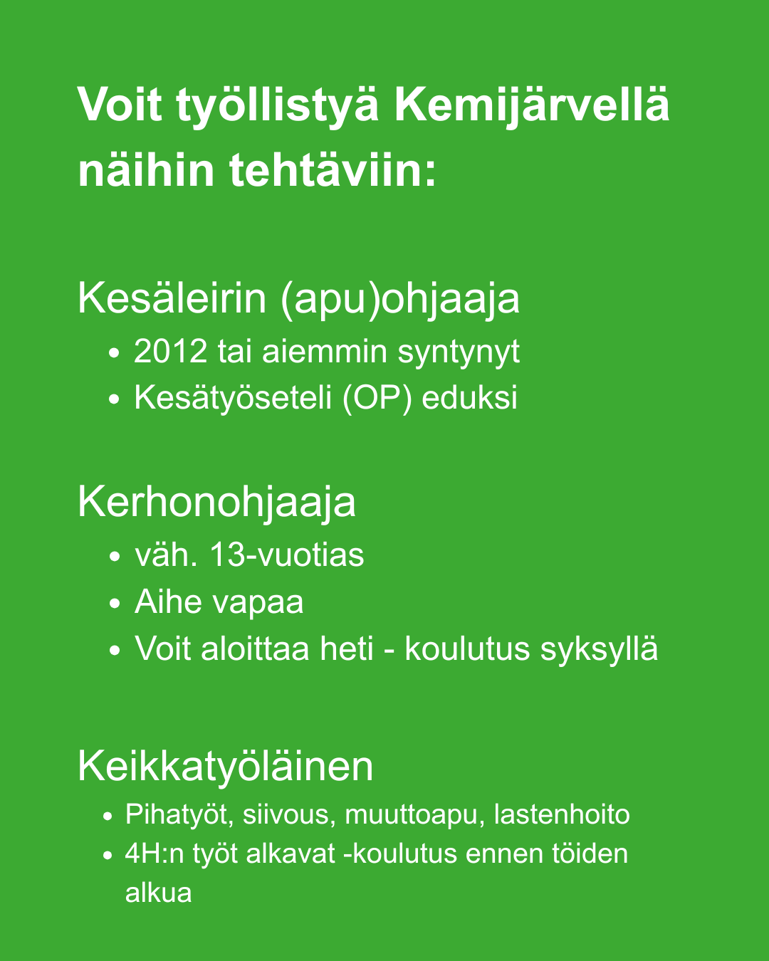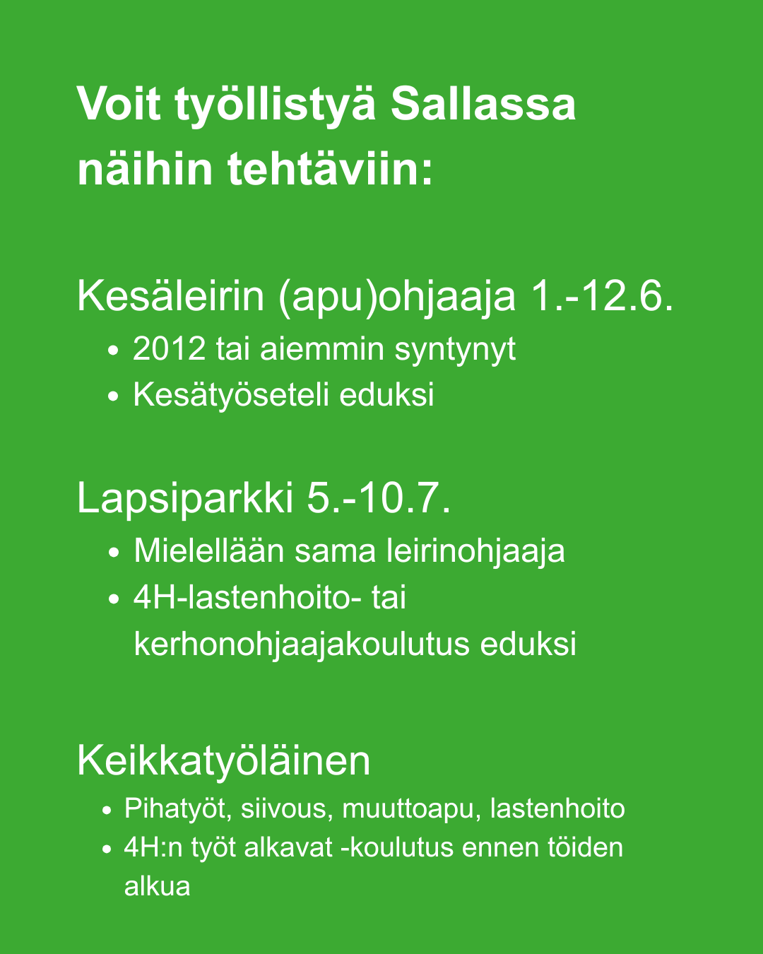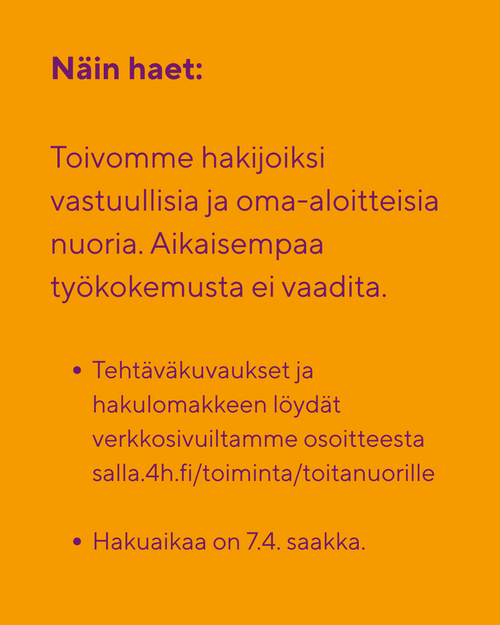 Työhön valitun tulee myös käydä 4H:n järjestämä Työt alkavat -kurssi.