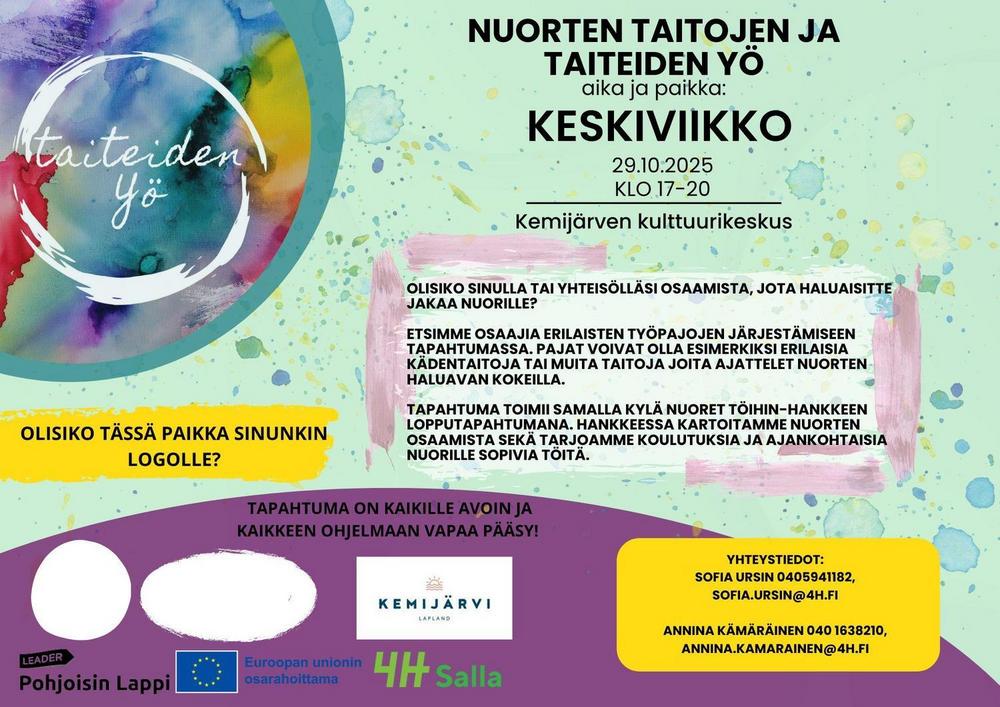 Haemme nyt tapahtumaan yhteistyökumppaneita. Tapahtuman tarkoituksena on tuoda nuorten taitoja esille ja tarjota nuorille erilaisia työpajoja omien taitojen kartoittamiseen. Tapahtumaa olemme testanneet viimevuoden marraskuussa Sallassa ja nyt olisi tarkoitus saada tapahtuma myös Kemijärvelle.